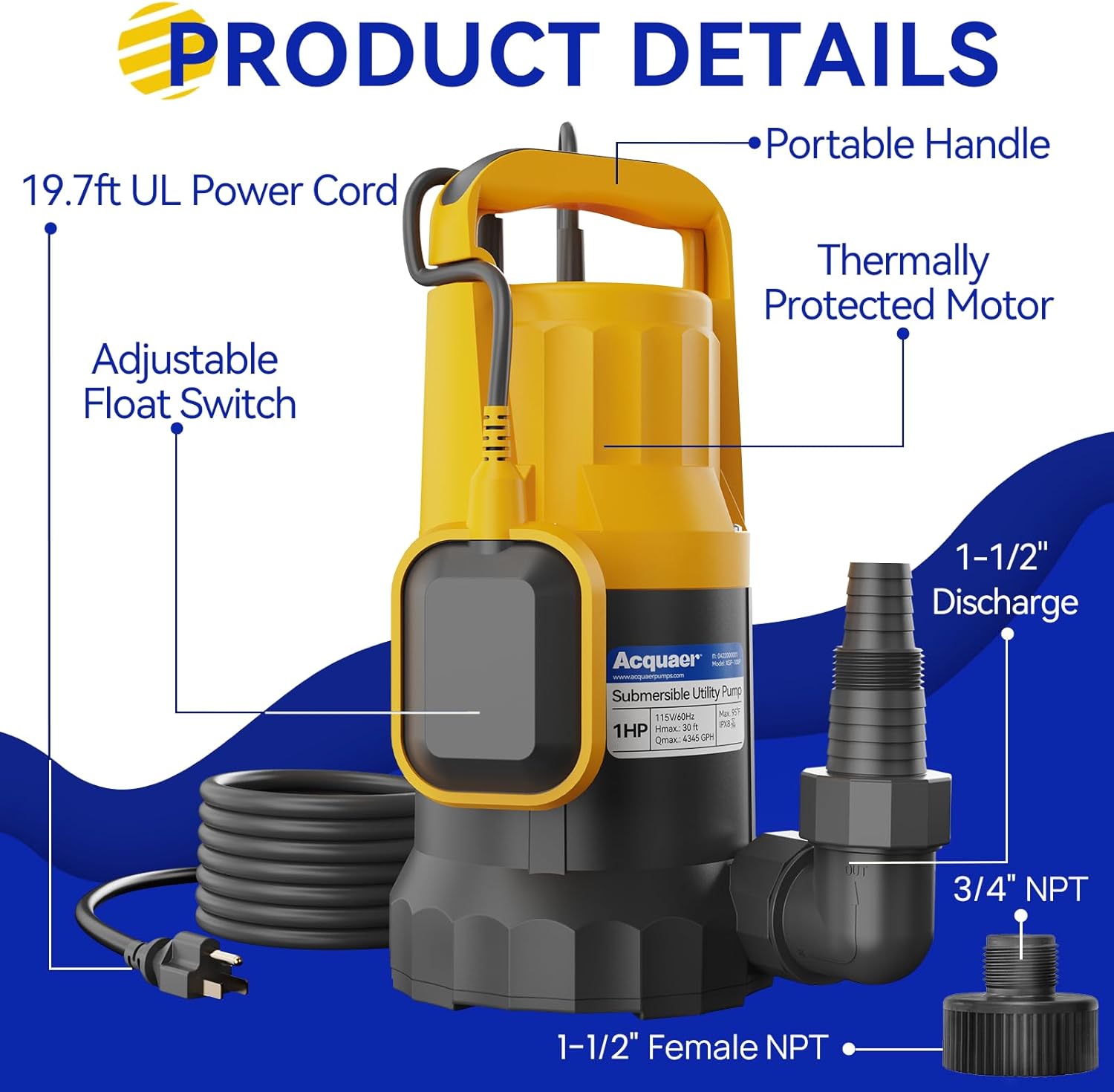 Acquaer 1HP Utility Pump 4345GPH Submersible Sump Pump with Automatic Float Switch, Water Removal for Hot Tub, Pools, Basements, Garden Pond
