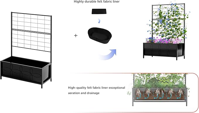 - This planter with trellis is made of a strong carbon steel base. It's sturdy and solid for long time and durable usage. Moisture Resistant,Maintain beauty and performance.