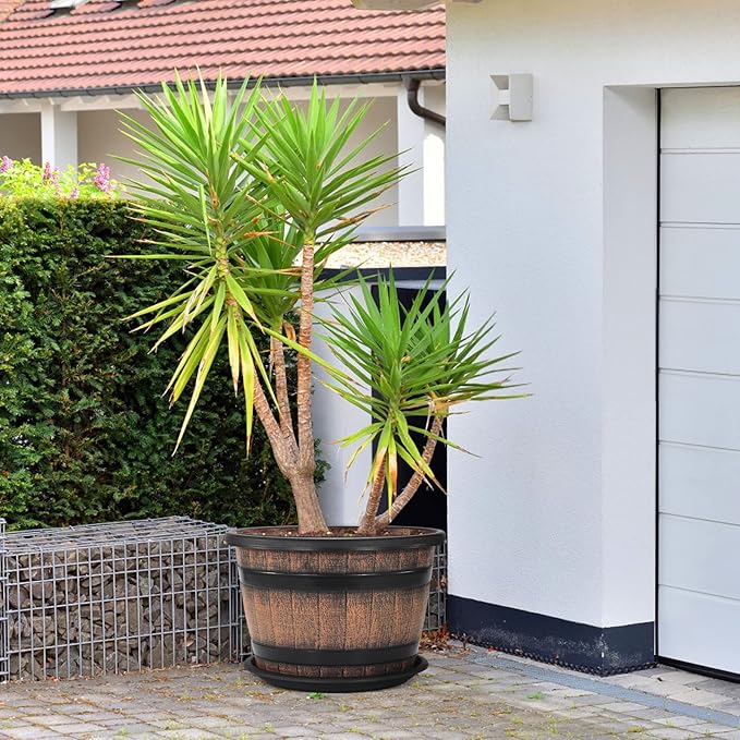 Quarut Large Plastic 3 Pack16 inch Plant Pots,Whiskey Barrel Planters with Drainage Holes & Saucer.Flower Pots Imitation Wine Barrel Design for Indoor & Outdoor Garden Balcony Plants.7 Gallons(Brown)