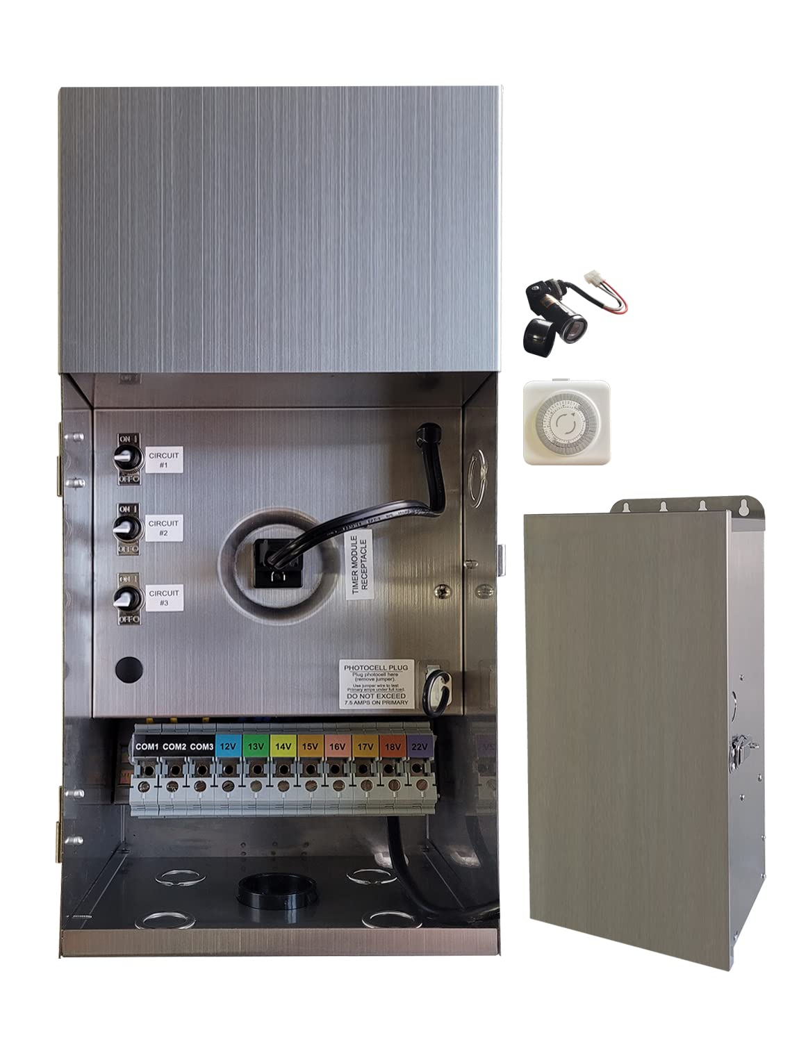 - Durable & Waterproof:Top grade 304 stainless steel outer shell does not corrode, protects the transformer against all severe weather conditions.The transformer has a locking latch, which can be locked to prevent children from opening it and prevent rainwater from entering.Mounting slots on top and bottom for quick mounting without templates. Removable bottom plate with pre-punched knockouts, allowing great access during installation.