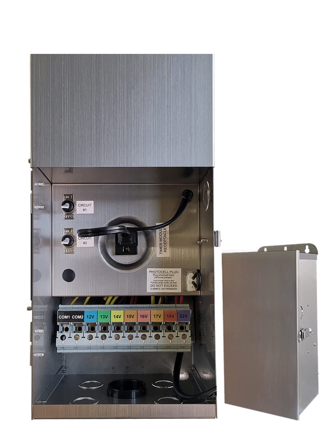 - Durable & Waterproof:Top grade 304 stainless steel outer shell does not corrode, protects the 600W transformer against all severe weather conditions.The transformer has a locking latch, which can be locked to prevent children from opening it and prevent rainwater from entering.Mounting slots on top and bottom for quick mounting without templates. Removable bottom plate with pre-punched knockouts, allowing great access during installation.
