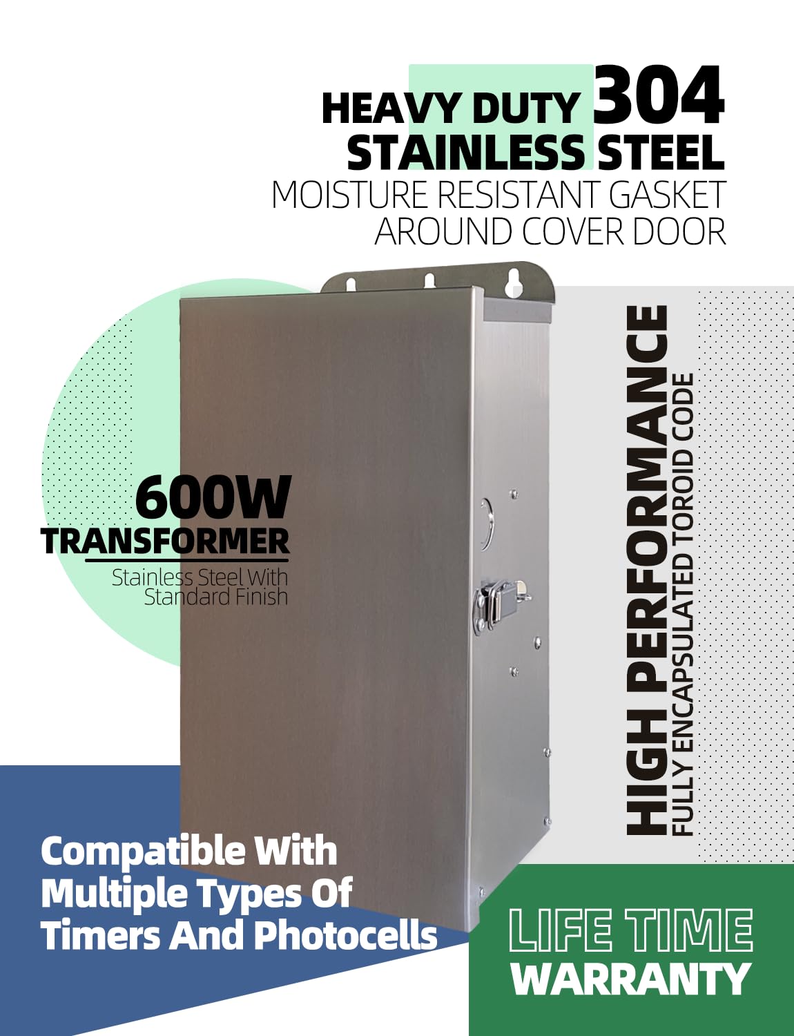 - Durable & Waterproof:Top grade 304 stainless steel outer shell does not corrode, protects the transformer against all severe weather conditions.The transformer has a locking latch, which can be locked to prevent children from opening it and prevent rainwater from entering.Mounting slots on top and bottom for quick mounting without templates. Removable bottom plate with pre-punched knockouts, allowing great access during installation.