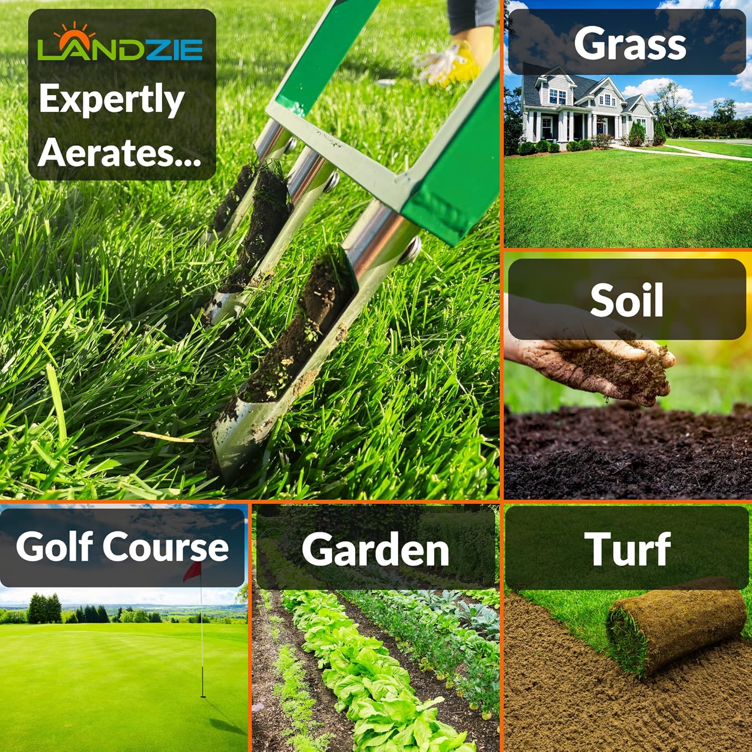 - HAVE THE LAWN OF YOUR DREAMS: Revitalize your lawn this season by using the Landzie Fork Lawn Plug Aerator to remove compacted soil and thatch and promote healthy grass growth throughout. Aerator coring your lawn encourages healthy root growth, enhances resistance to drought and flooding, and reduces the need for excessive amounts of fertilizer. USE your Landzie Soil Aerator with the Landzie Spreader (B07ZQSV81S) and the Landzie Lawn Level (B095KSKXPQ) for a lush and level lawn this season.