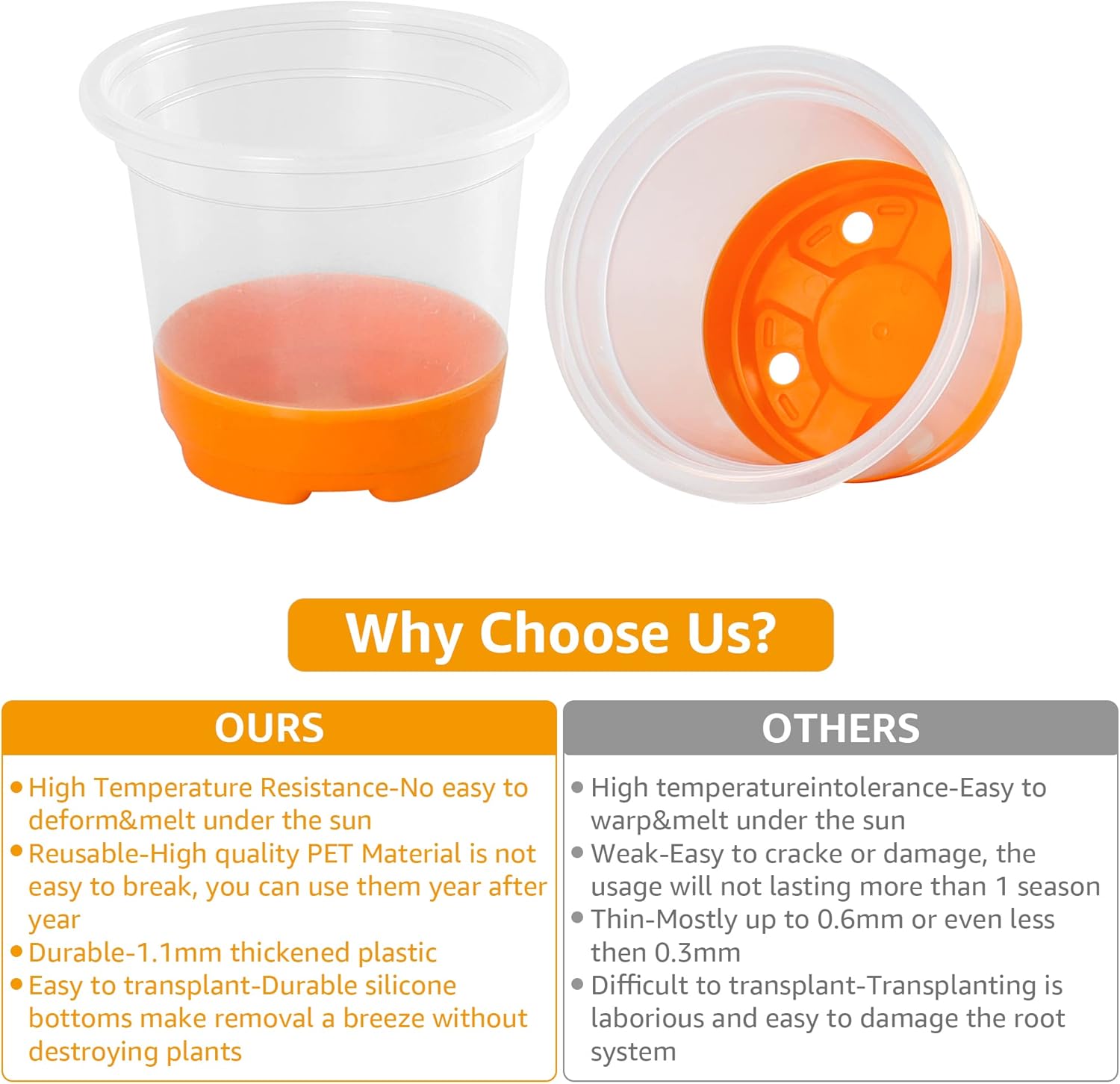 MIXC 30 Packs 4" Reinforced Clear Nursery Pots with Silicone Base for Easy Transplant, Transparent Plastic Plant Pot Reusable Seedling Pots Seed Starter Pots Flower Pot, Orange