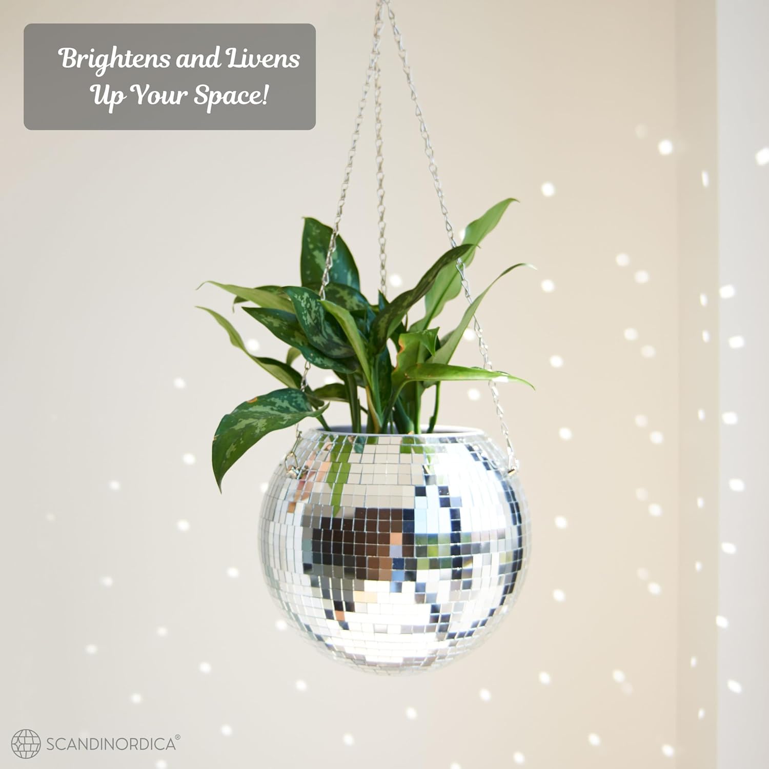 SCANDINORDICA Disco Ball Planter – Value Package: Mirror Disco Planter with Chain, Macrame Hanger and Acrylic Stand for Desk, Includes Self Watering Insert, Eclectic Home Decor | 10 inch Silver