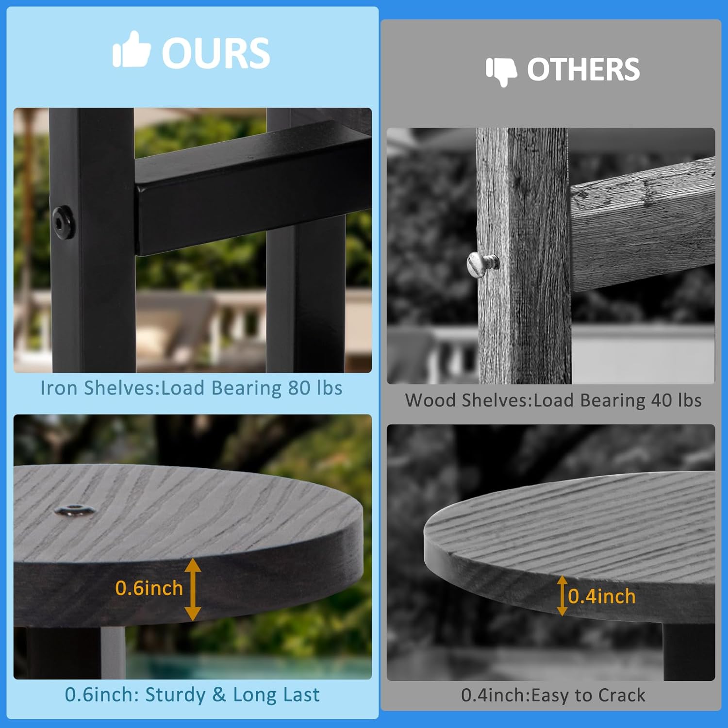 - IRON SHELF SUPPORT UP TO 80 LBS: Made of sturdy metal, this corner plant stand can hold up to 80 lbs ensuring long-lasting use. The sleek and shiny boards are natural, durable, and also easy to maintain. The round base is more stable than triangular and square bases. The stand's sturdy construction helps prevent accidental tipping, ensuring the safety of your beloved plants.
