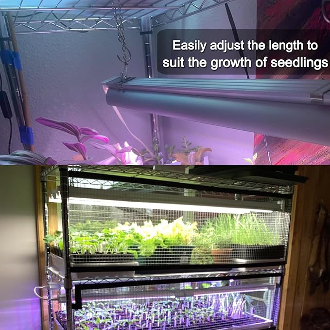 - Free combination -- Each of our chains has 2 S-shaped hooks to make the suspension stronger and safer. Multiple single chains can be combined into 1 suspension or multiple single chains can be connected into one long enough chain for use. It is suitable for hanging grow lights for seedling. The hooks of chain are open so you can easily adjust the length. Perfect for raising the lights as the seedlings grow.