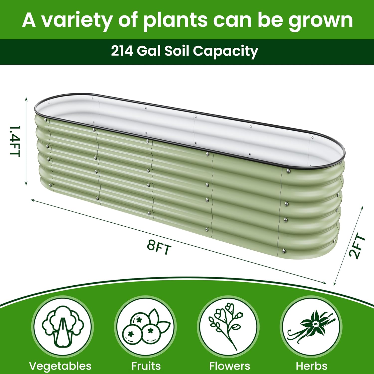 8 X 2 X 1.4 Ft Galvanized Raised Garden Bed,Sturdy and Easy to Assemble Oval Raised Planter Beds Outdoor for Vegetables, Gardening, Flowers, Fruits(Light Green)