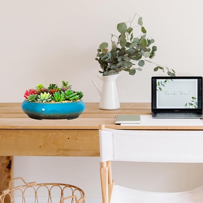 Succulent Pots - 11.5 Inch Ceramic Bonsai Pots with Drainage, Large Shallow Succulent Planters for Indoor Outdoor Plants, Round Glazed Cactus Flower Plant Container Bowl Home Desk Decor(Blue)