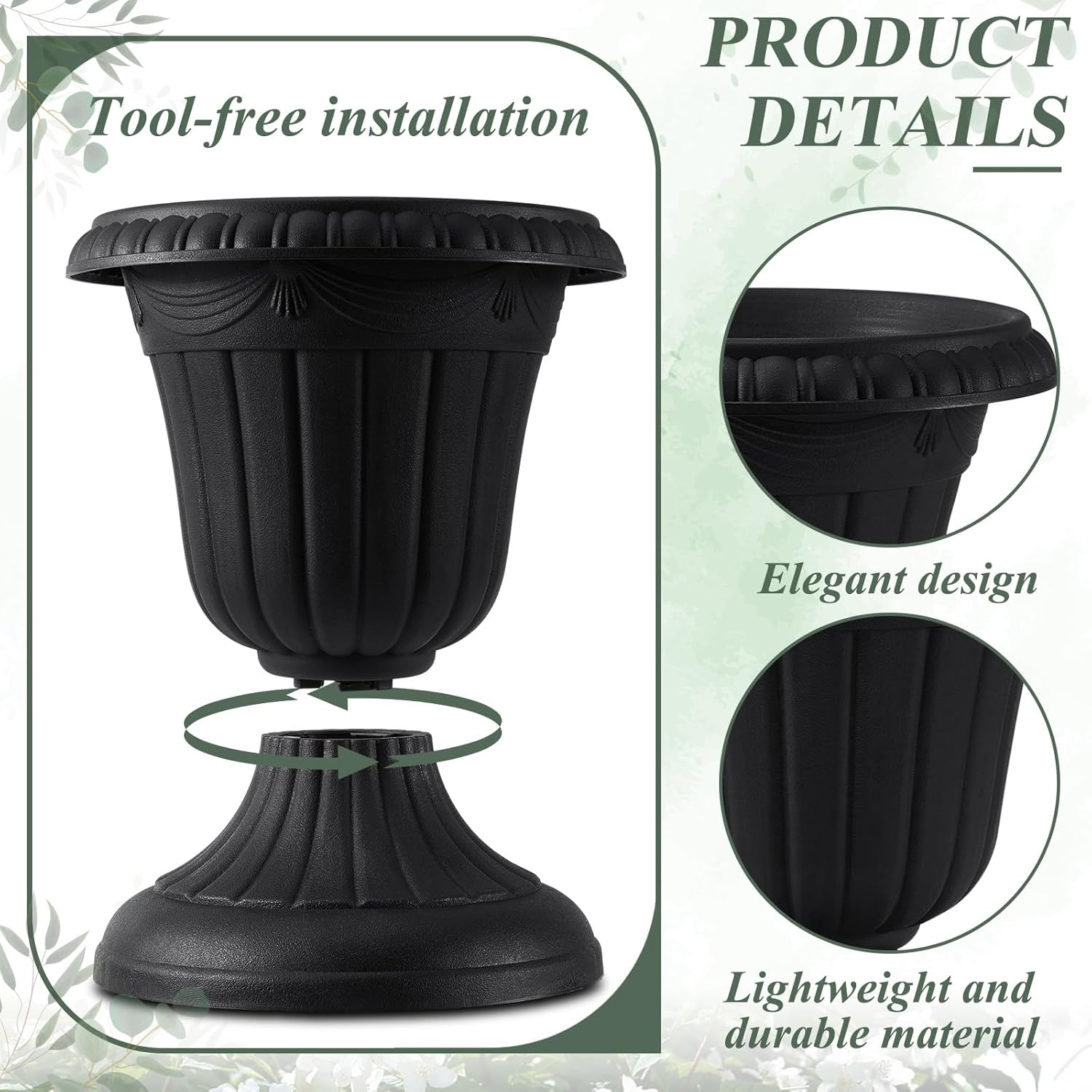 Zhehao 4 Pcs Plastic Urn Planter 10 x 11.5 Inch Black Classic Flower Pots Front Porch Planters Indoor Outdoor Planters with Pedestal for Wedding Party Bridal Shower Garden Patio Home Decor