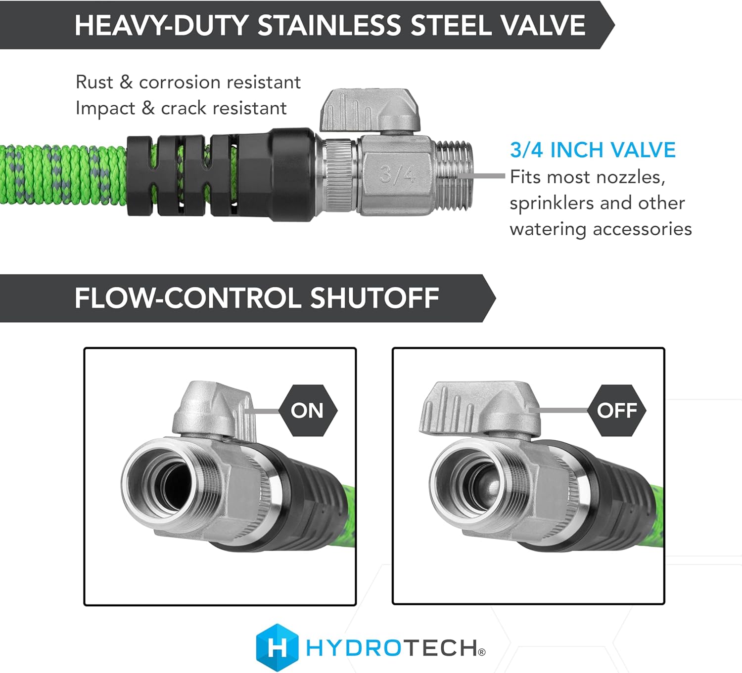 - 2X FLOW: 3/4" inner core allows for maximum flow. Hose features a heavy-duty stainless steel valve with flow-control shut-off