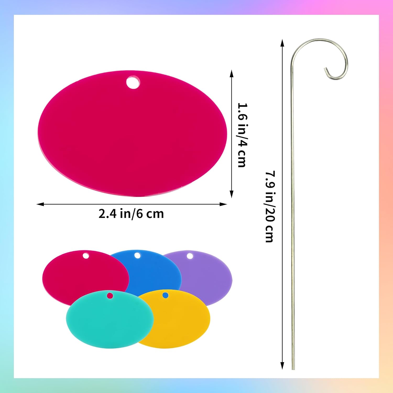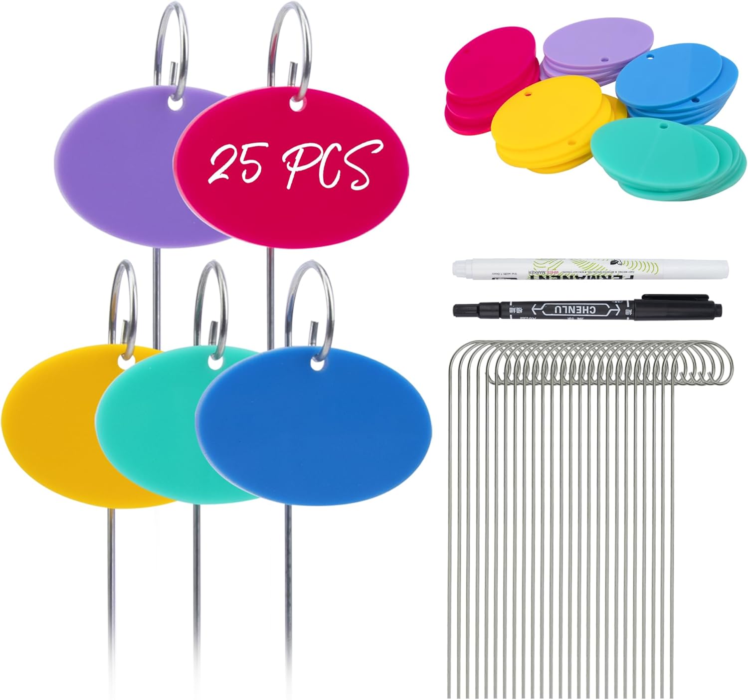 - Package and Size: 25 x acrylic plant label (measuring 1.6 x 2.4 inch/4 x 6 cm), 25 x stainless steel stake (7.9 inch/20 cm), 2 x markers (black & white). Labels come in 5 colors: red, purple, yellow, light green and blue.