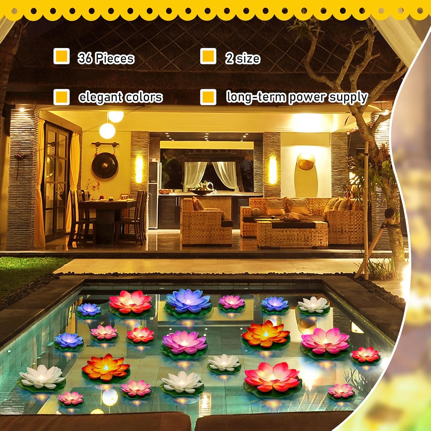- What You Can Get: you will receive 36 pieces of lotus floating lights in elegant colors for decorating your pool, including 2 sizes, respectively 24 pieces in the small size and 12 pieces in the large size, so the quantity is sufficient for you to decorate and replace