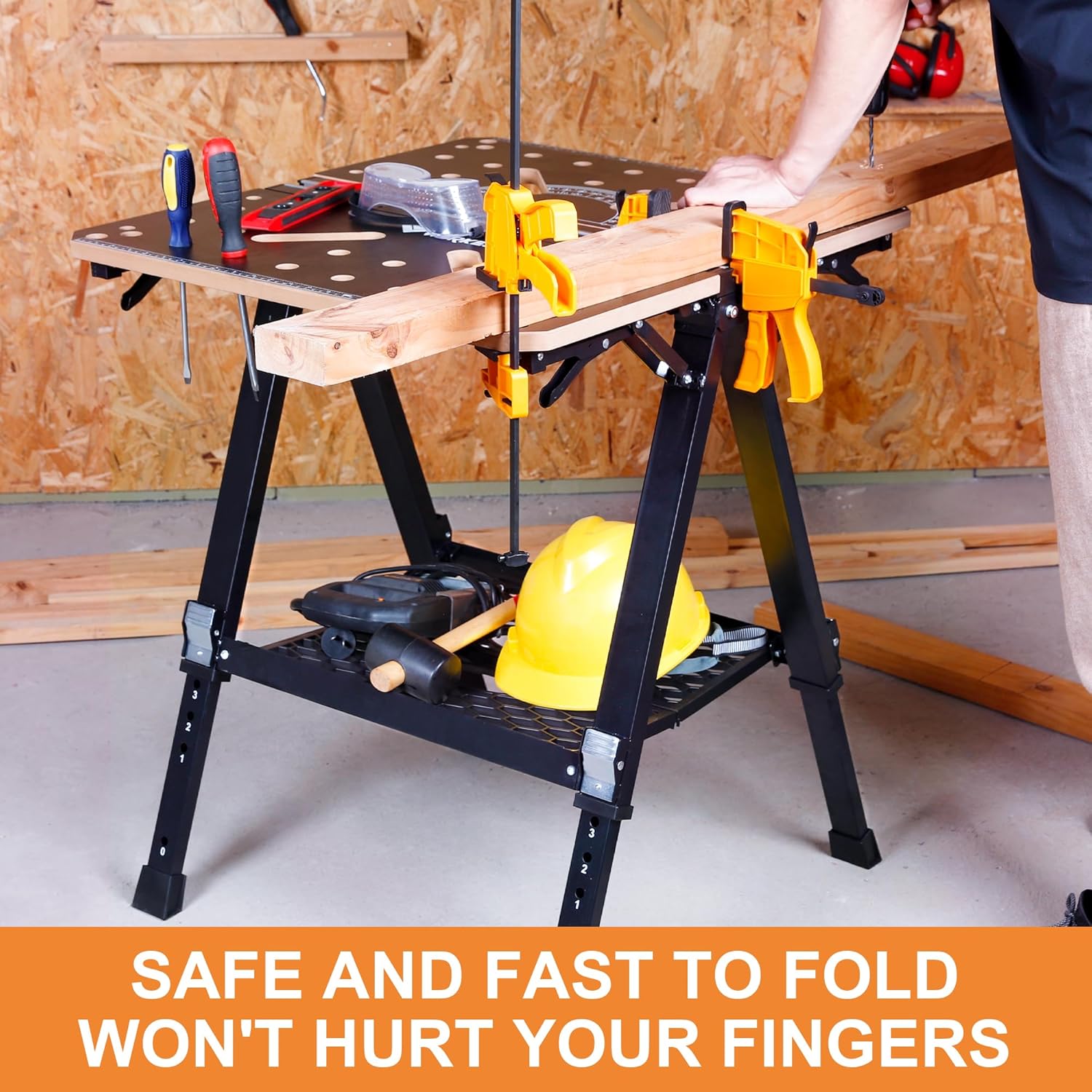 - 【MAKE ANY PLACE YOUR WORKSPACE】Set up of the garage workbench is a breeze and literally takes just a few seconds. Spread the sawhorse legs, lift the "wings" of the table until they click and lock in place and you're done. Its 34.8lbs lightweight makes transportation between sites effortless.
