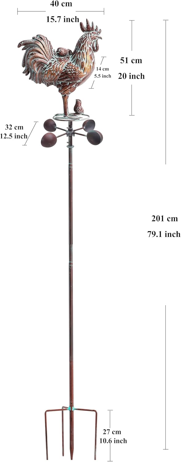 - Metal Chicken Rooster and Chicks Wind Spinner for Yard and Garden - The rooster sculpture garden stake measures 79" H x 15.7" L x 12.5" W. This vintage-style vintage metal chicken decoration not only enhances your gardening decor but also serves as a conversation starter, making it a unique addition to outdoor. Perfect decorative accent piece to enhance rustic, country, or farmhouse style outdoor interiors