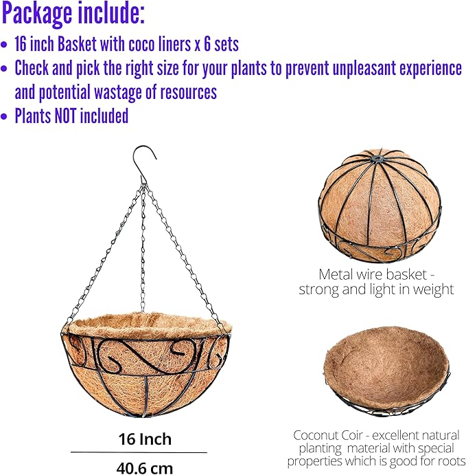 LaLaGreen Hanging Planter for Outdoor Plants (6 Pack, 16 Inch) Hanging Baskets with Coco Liner, Metal Wire Flower Basket Pots with Hook Hanger Balcony Porch Farmhouse Country Style Garden Decor