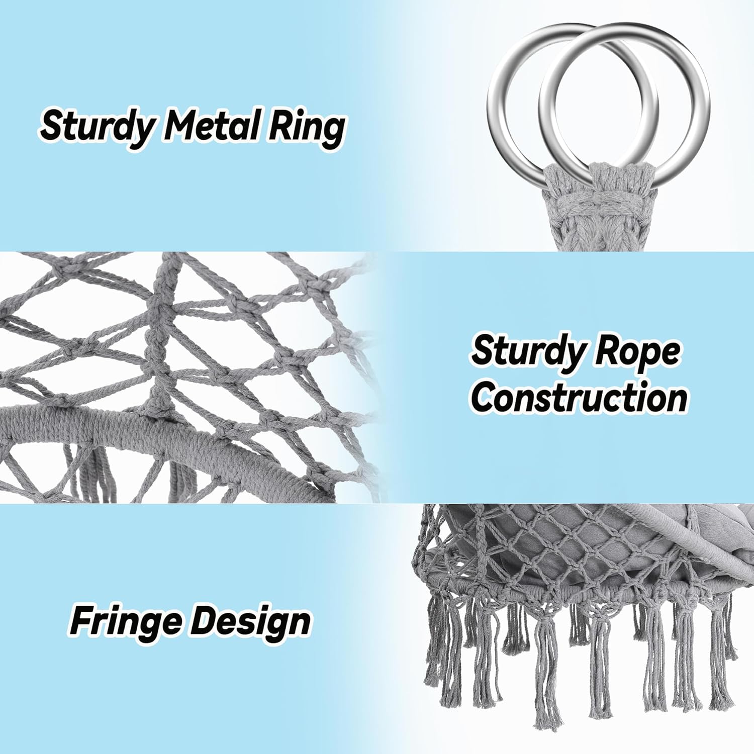 - 【SOLID STEEL FRAME】Our macrame hammock swing chair frame is a single piece of powder coated steel, unlike other products which require complicated assembly of the frame