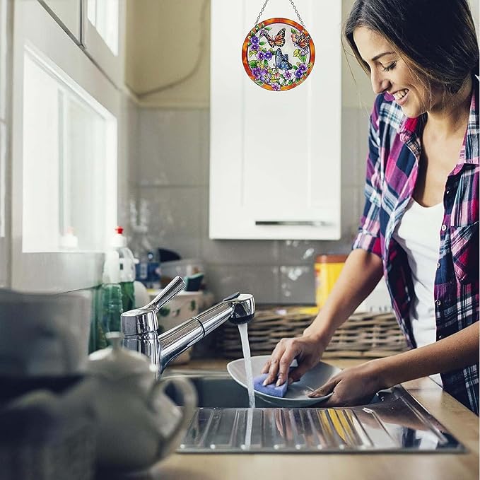- 【Pretty Window Decoration】This is a very pretty suncatcher. It's not huge (about the size of your hand) which is the perfect size for the windows. It adds a nice accent to a window without dominating it .so you can look outside to spot real butterfly and flowers.The colors are bright and catch the sun beautifully. It comes in a color box gift packaging.