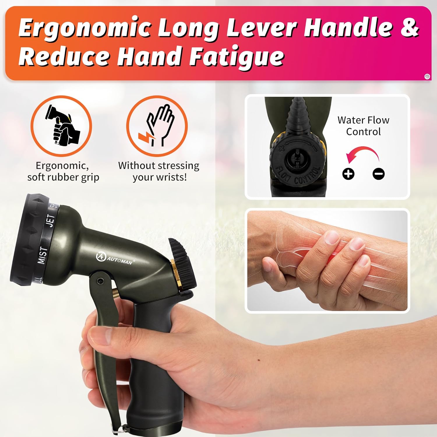 - METAL CONSTRUCTION:The AUTOMAN garden hose nozzle is built using heavy duty metal. It better stands up to impacts and resists corrosion. The shock resistant rubberized bezel dial protects the nozzle from accidental drops. Our garden nozzle is 100% metal and high quality to prevent leaks, rusts and corrosions, much more than the plastic water nozzles.