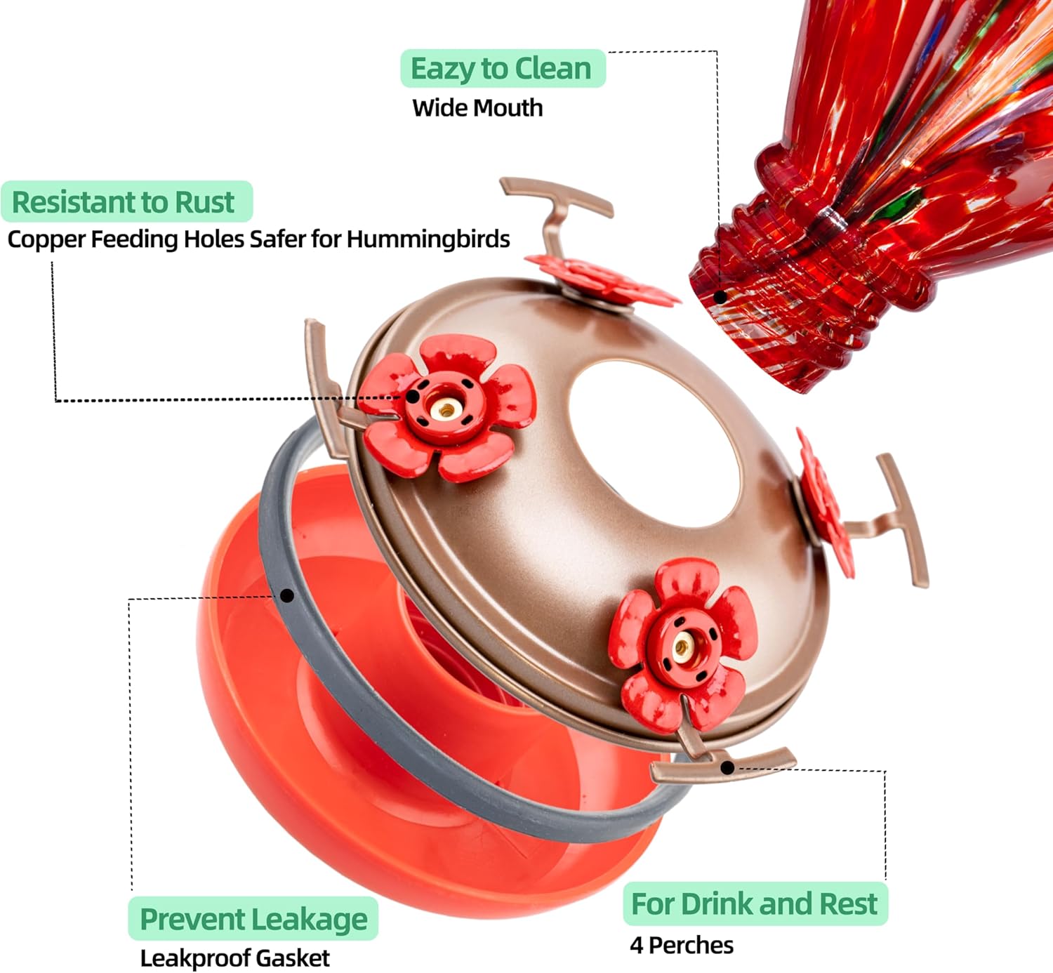 - 【Leakproof and SAFER Feeder Ports】The metal base is equipped with sealing ring and plastic basin for leakproof. UPGRADED feeder ports are made with premium copper materials, no sharp edges . Make sure the gasket is securely attached before you hanging the hummingbird feeders outside.