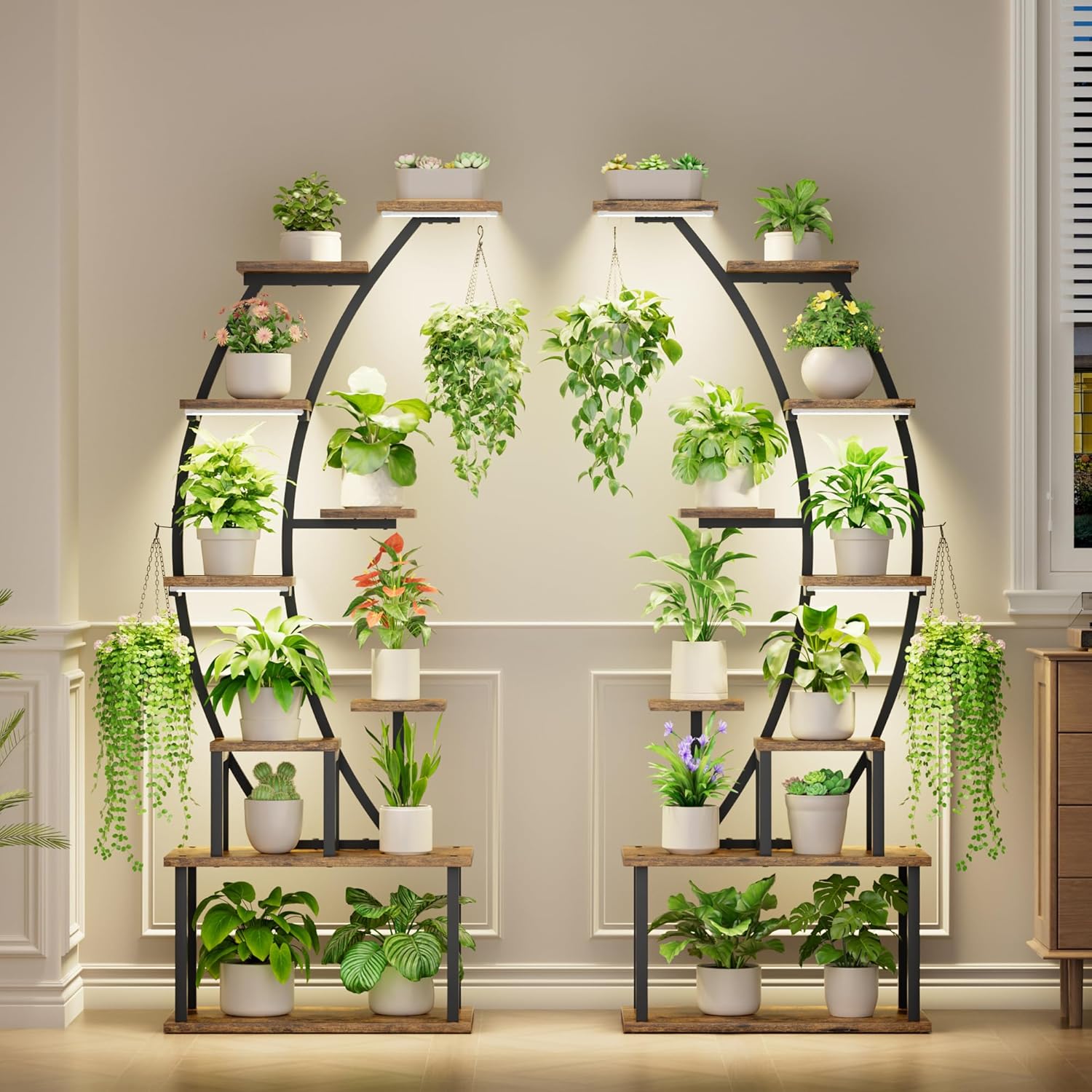- 【Plant Stand with Grow Lights】 To promote healthy plant growth, we have equipped this indoor plant stand with full-spectrum grow lights to meet the lighting conditions that plants need most at different stages. Three-head grow lights ensure that plants on all layers receive ample light. You can place this plant shelf indoors anywhere, and also don't need to frequently move plants outdoors to absorb light.