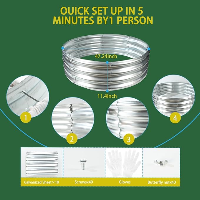 - 【STABLE】: This round raised garden bed is 47 IN Diameter,11.8 IN Tall, each is made of 0.8 MM thick Q195 galvanized metal sheet, double-layer anti-corrosion galvanizing and round structure design,it will provide a solid foundation for your plants