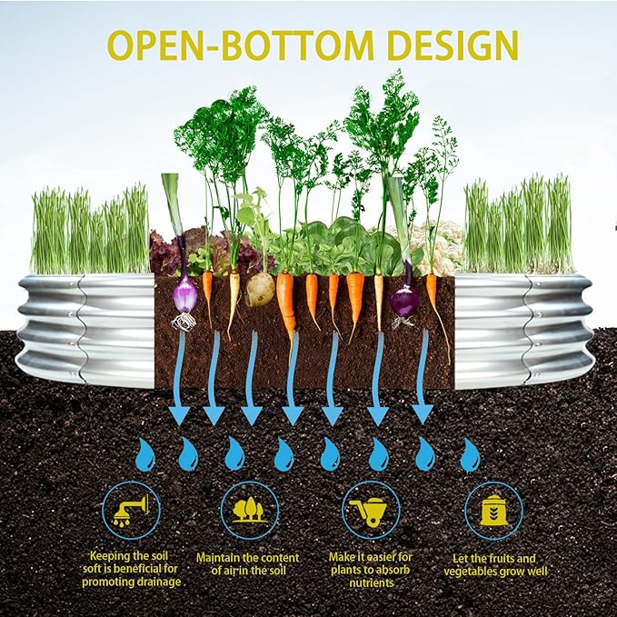 - 【OPEN BOTTOM】: This galvanized raised garden beds have open bottom design,which promotes healthy drainage and allows for deeper root growth, ensuring your plants thrive