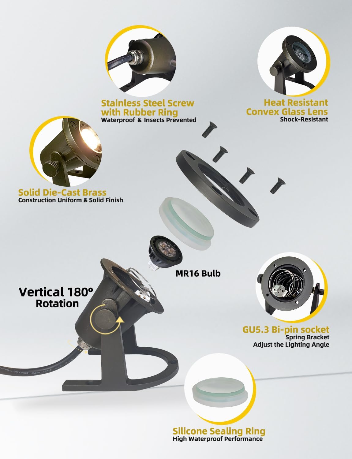 - Replaceable Bulb: The COLOER bronze underwater light uses a design with separate light fixture and bulb, which offers a longer lifespan compared to the non-detachable integrated design. You can replace the bulb without having to replace the entire fixture just because the bulb is broken. You can also replace the MR16 bulbs with other colors according to different festivals to enhance the atmosphere of the scene.