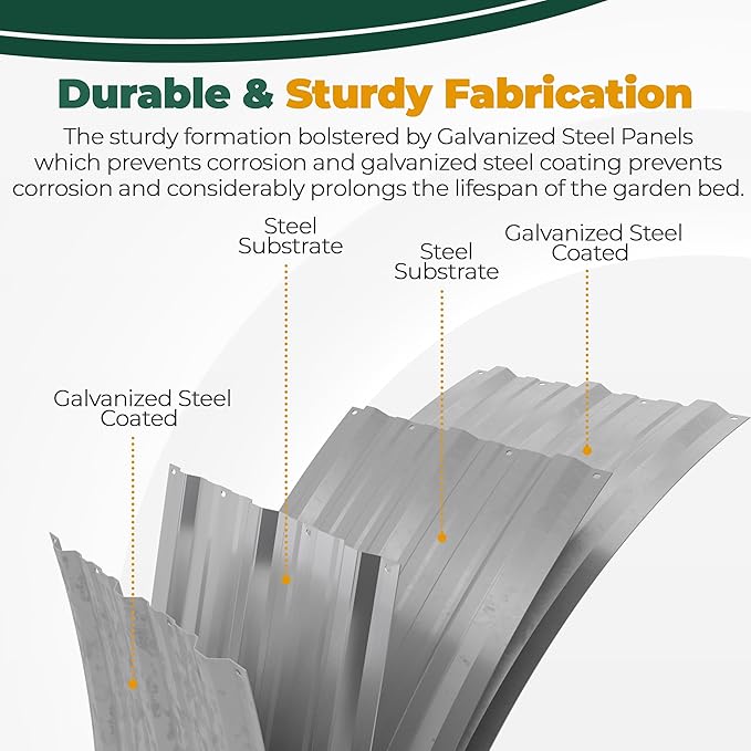 - Lightweight Galvanized Steel - The outdoor raised garden beds are made from lightweight galvanized steel, ensuring exceptional longevity and durability. Also, it prevents it from corrosion and rust, offering a long-lasting gardening solution. Moreover, the middle support strip provided exceptional strength to our lightweight Galvanized Raised Garden Bed.