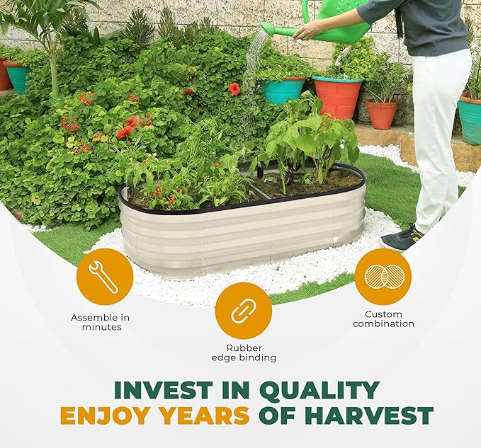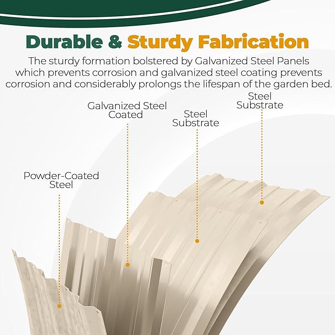 - Lightweight Galvanized Steel- The outdoor raised garden beds are made from lightweight galvanized steel, ensuring exceptional longevity and durability. Also, it prevents it from corrosion and rust, offering a long-lasting gardening solution. Moreover, the middle support strip provided exceptional strength to our lightweight Galvanized Raised Garden Bed.