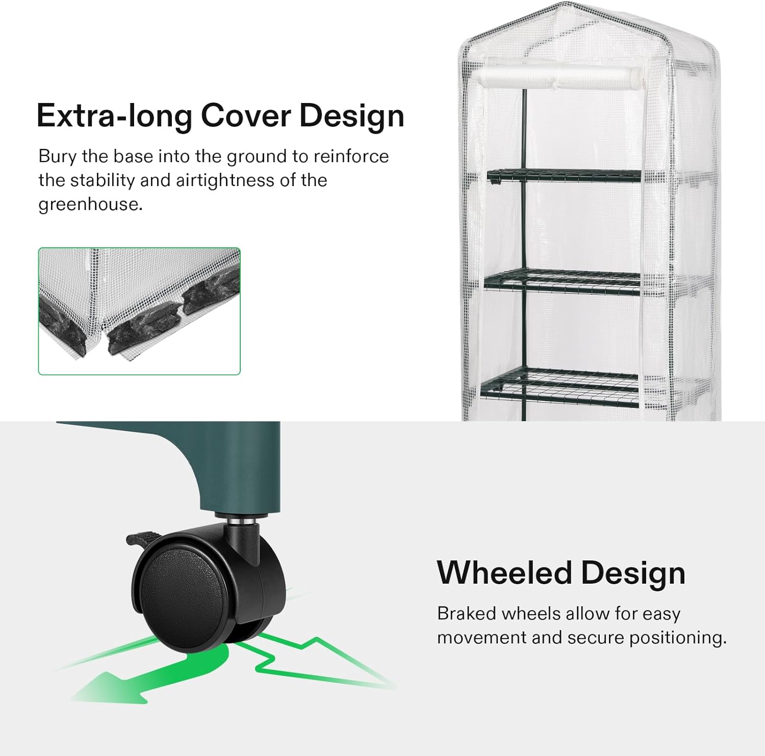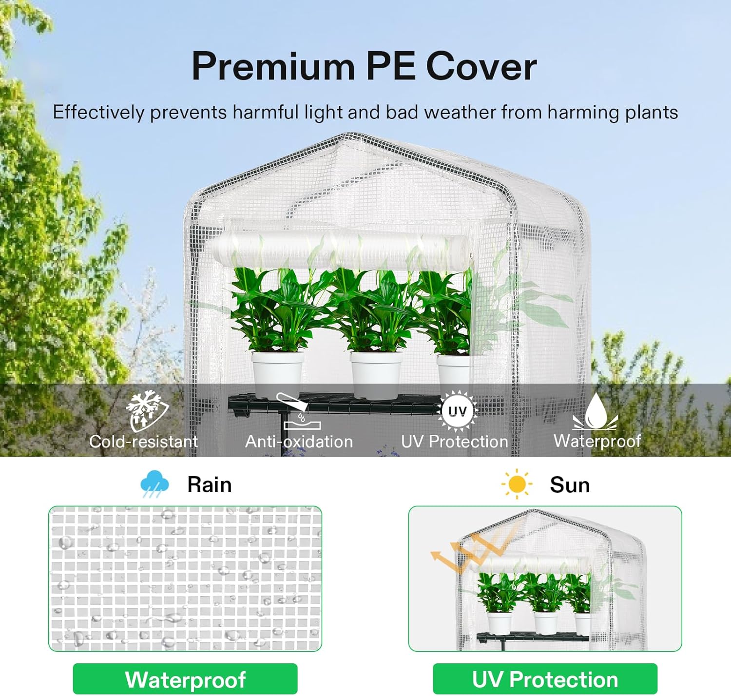 - Sturdy & Durable Framework: Supported by a powder-coated heavy-duty steel frame, the green house is very sturdy and firm; Burying the base into the ground enhances its stability and safety