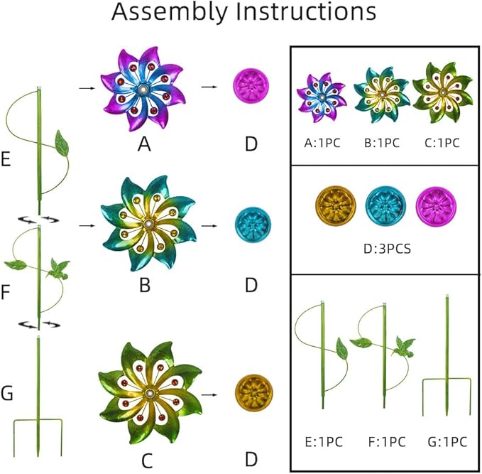 - Easy To Assembly: Our wind spinners for yard and garden comes with easy-to-follow instructions, allowing you to set up this yard spinner in no time. Enjoy the simplicity of its assembly process, transforming your patio decor or yard decor without hassle.
