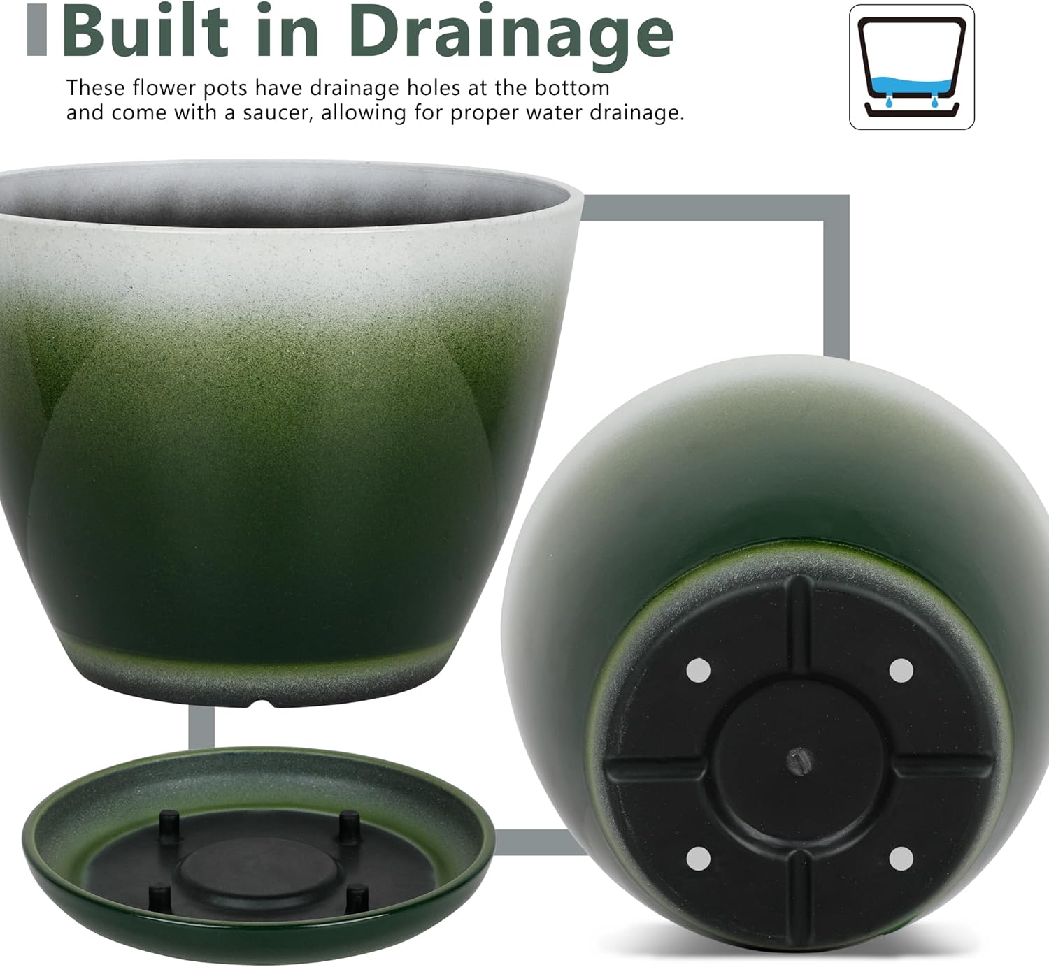 - Drainage Hole and Saucer: Each pot has a drainage hole at the bottom to ensure proper drainage and prevent waterlogging; The saucers included with the pots help to catch excess water and keep the plants healthy
