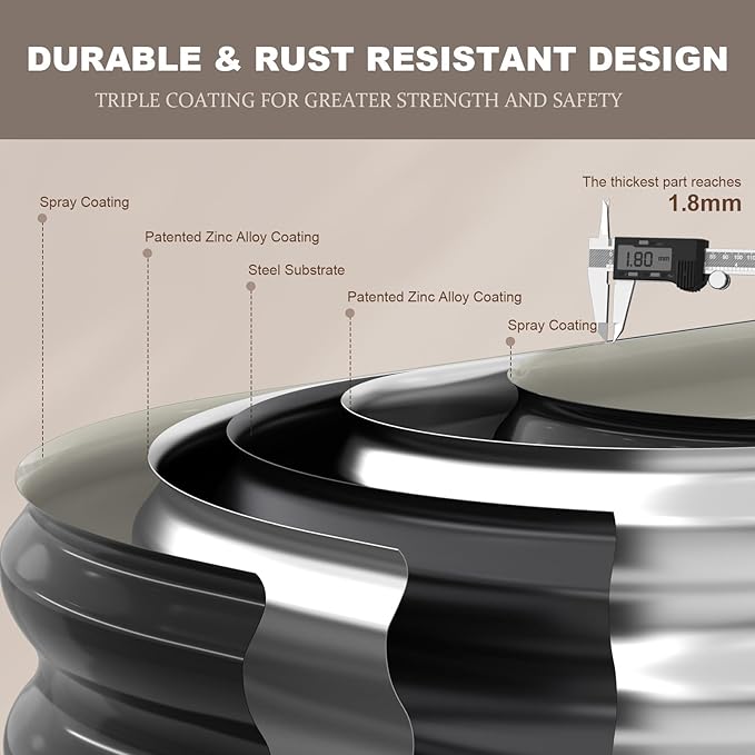 - DURABLE DESIGN: This galvanized raised garden bed, with a Zinc-Aluminum coating, is designed to enhance longevity and withstand various environmental conditions. The coating helps prevent oxidation and increases surface hardness. Its thickened design and oval shape ensure even pressure distribution, making it highly resilient against external forces. Reusable for years