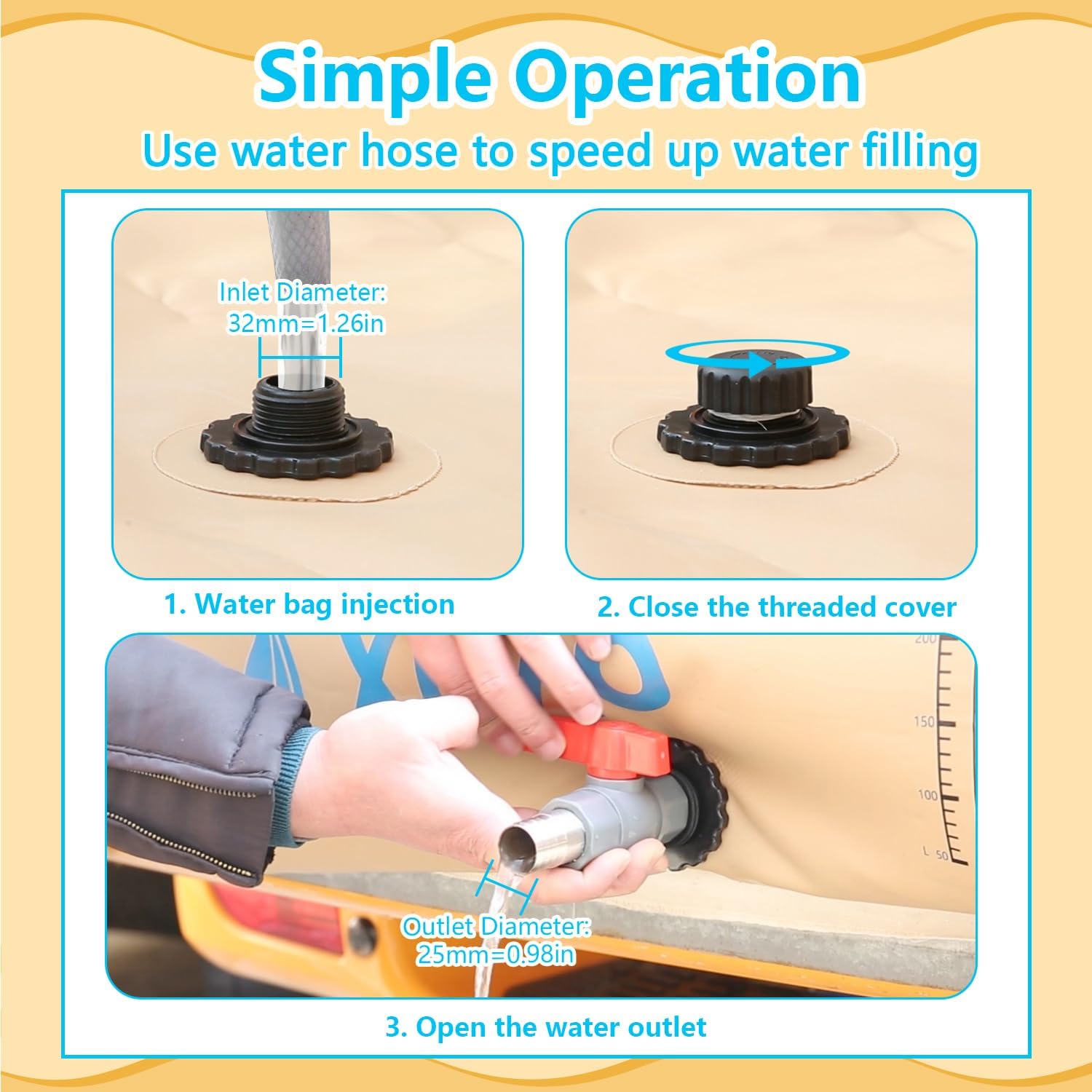 - 【Easy to Use】The top of the water bag is the water inlet, and the bottom is the water outlet. Just turn on the water outlet valve, and you're ready to fill water troughs, water your garden, and more. The water barrel features a foldable design for easier carrying and storage. You can leave the water barrel in your garage or utility room when not in use, saving you even more space.