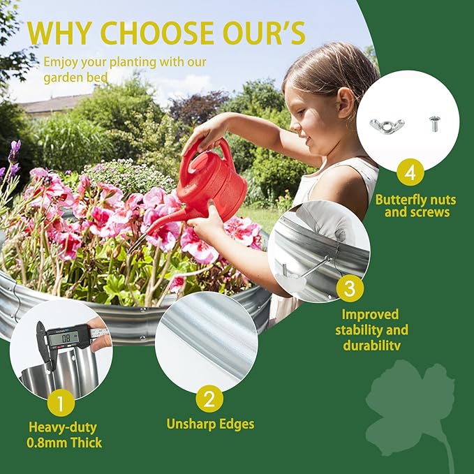 - 【EASY ASSEMBLY】: This galvanized steel raised garden bed only takes about 15 minutes to assemble easily,a screwdriver and a pair of gloves are need,which are prepared in the package already