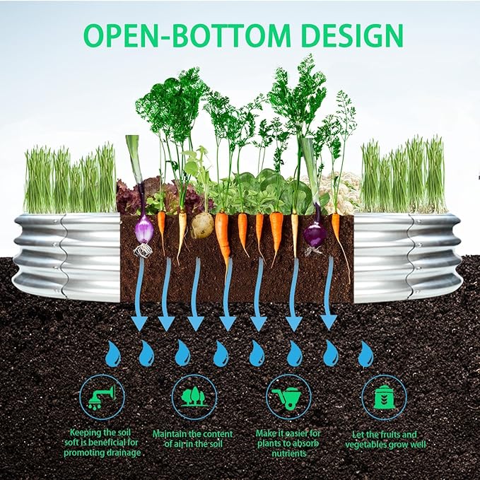 - 【OPEN BOTTOM】: This galvanized raised garden beds have open bottom design,which promotes healthy drainage and allows for deeper root growth, ensuring your plants thrive
