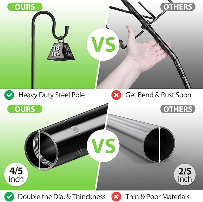 - Heavy Duty: Made of high-quality steel with a rust-proof finish, this outdoor bird feeder pole is sturdy enough to hold a heavy suet feeder and even climb squirrels without bending or breaking.