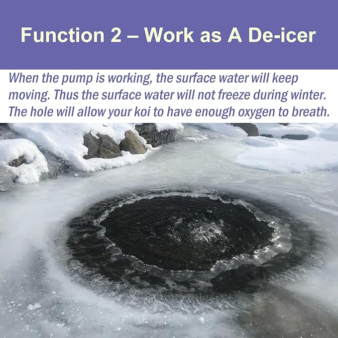 - DUAL-FUNCTIONAL - This versatile pond air pump serves a dual purpose. Not only does it work as a pond aerator, but it also functions as a pond deicer during winter months. By creating a ventilation hole, it allows your koi to breathe and ensures their well-being even in colder temperatures.