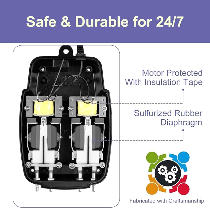- SAFETY & DURABILITY - The sulfurized diaphragm of this pond bubbler enhances its durability, ensuring long-lasting performance. Additionally, the chrome-plated air outlets are corrosion-resistant, further contributing to the pump's durability and longevity.