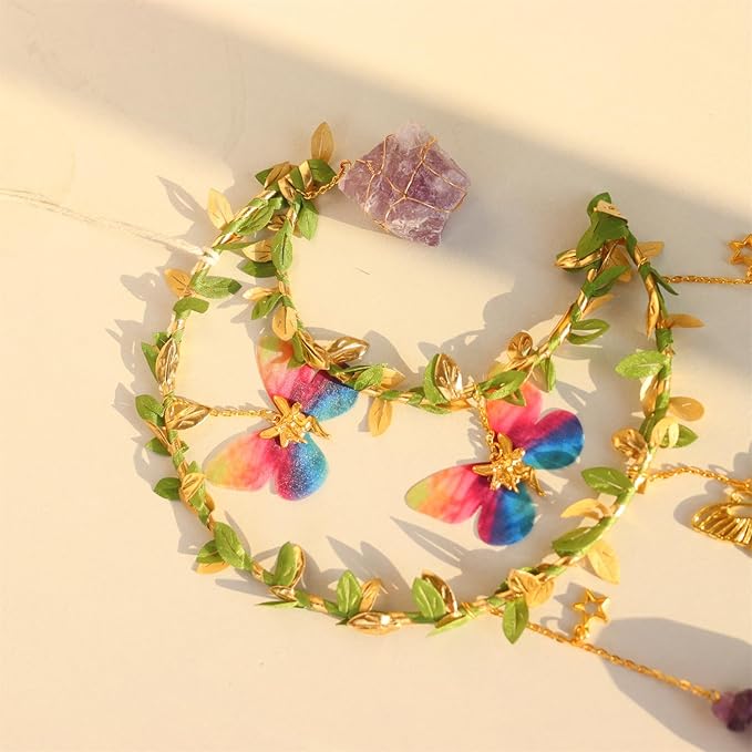 - 🍃Materials -- We replaced the metal chain with white twine for hanging, sturdier, and closer to nature. The gold-plated moon frame is wrapped in green and gold plastic ‘rattan’. The two flying butterflies are made of waterproof PTE material.