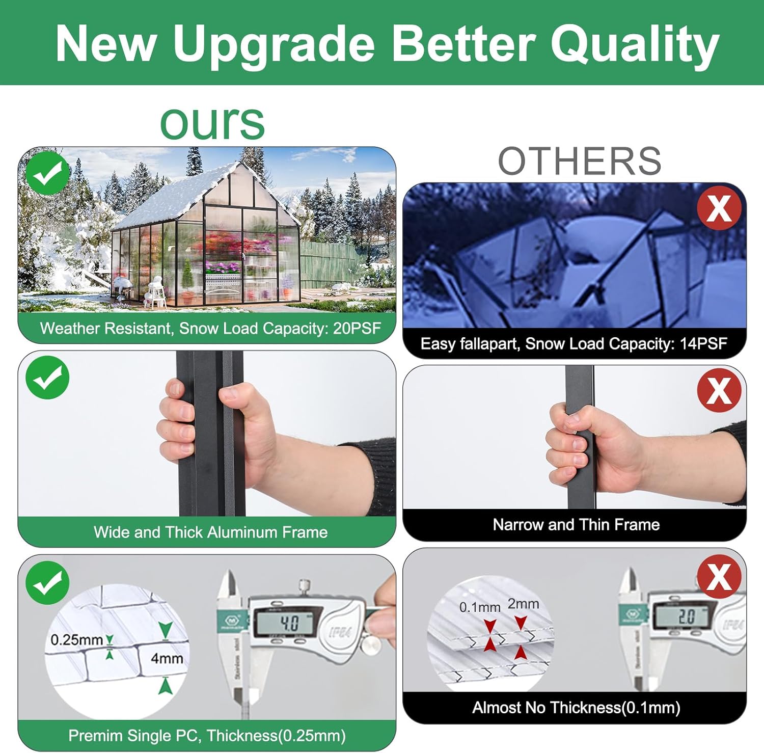 - 【Sturdy Frame】Our greenhouse kit boasts a robust rust-resistant aluminum frame designed to withstand various weather conditions. 2 skilled enthusiasts can assemble this greenhouse kit in just 4 hours. Introducing patented technology, Easy assembly, saving you 50% of your time. Gone are the days of tedious setups. With a simple push and locking screw, our Quick Connect ensures a reliable, secure, and swift link-up.