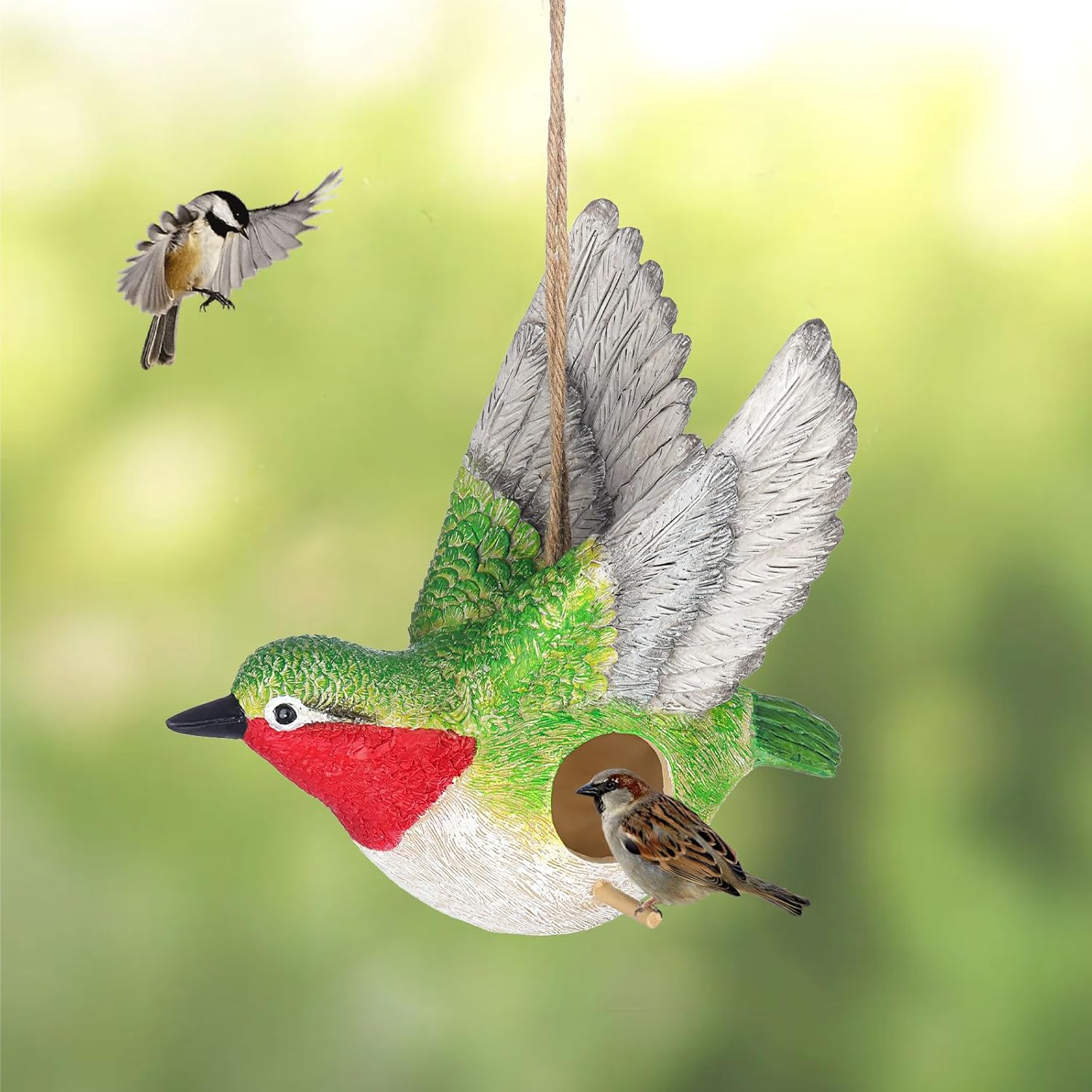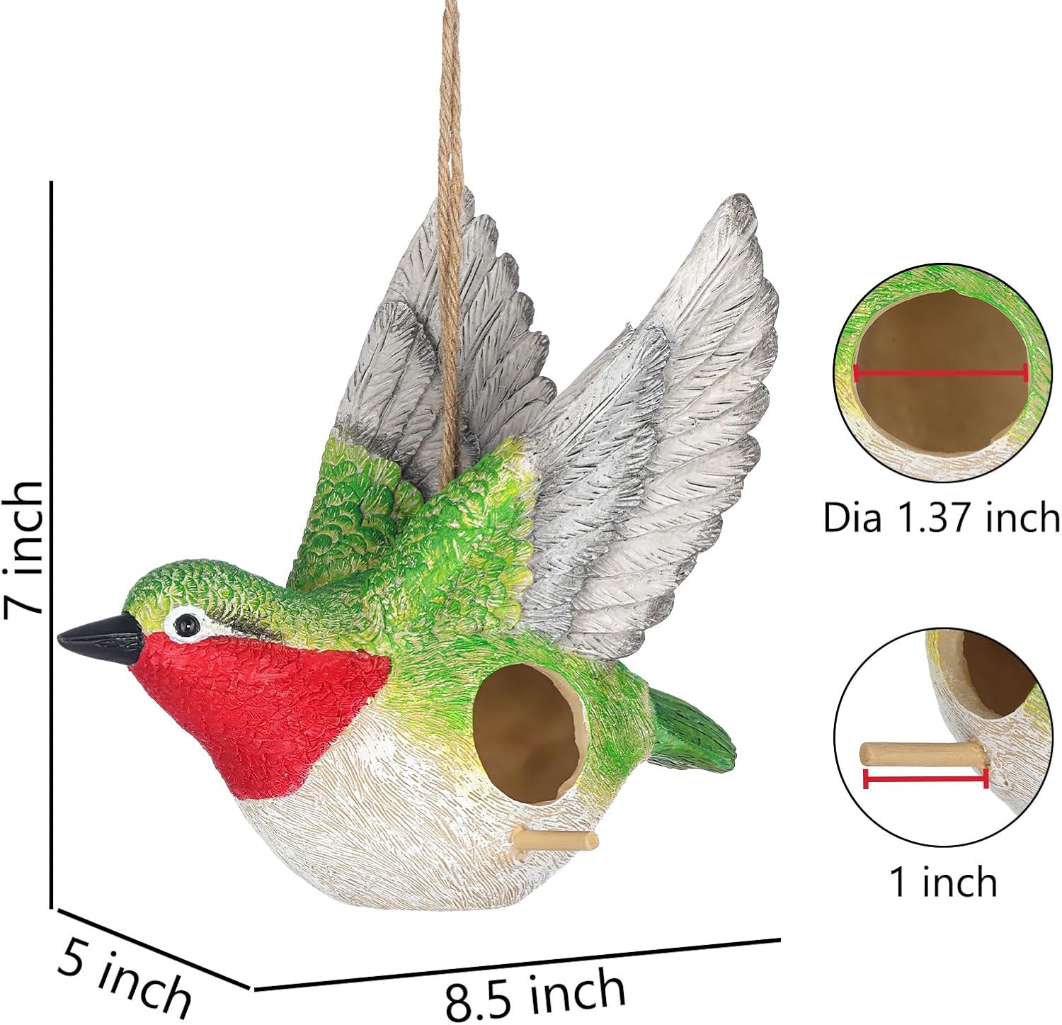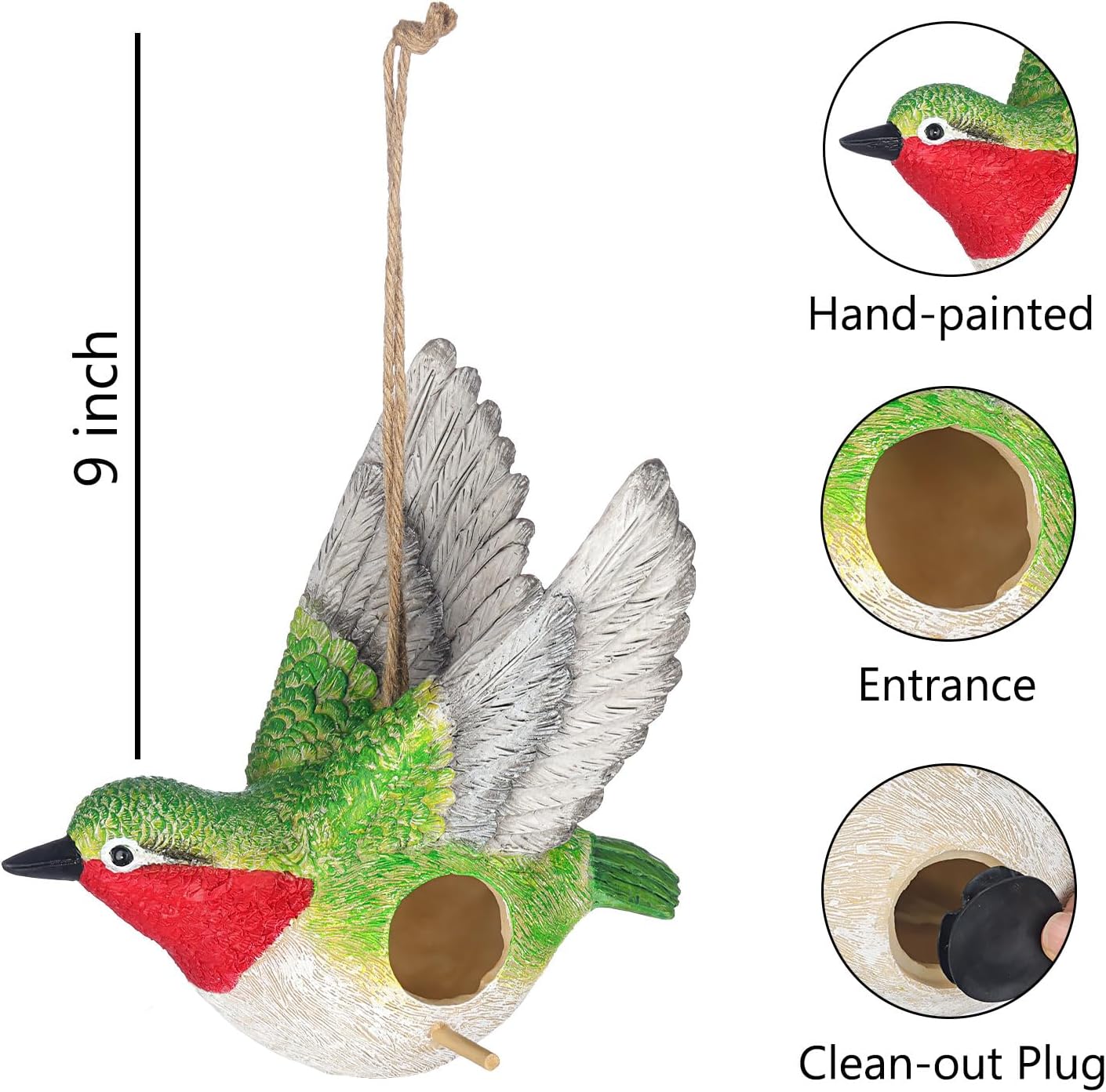- Hanging Bird House: The bird house is designed into a cute hummingbird shape with hand-pained coating. It will attract different kinds of birds by this eye-catching design. This bird house will be a warm shelter when they encountered bad weather.