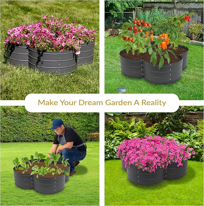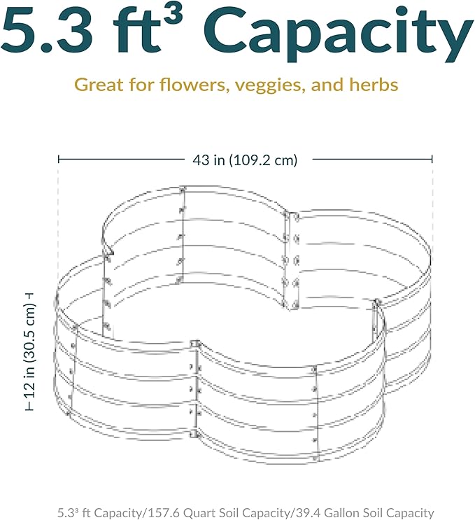 - AMPLE SPACE FOR HEALTHY GROWTH: This galvanized metal garden bed has a unique clover shape that provides plenty of room for growing a variety of deep-rooting plants in the backyard. The raised planter box measures 43" W x 43" D x 12" H, weighs 9.2 lbs, and has a soil capacity of 39.4 gal (5.27 cu ft).