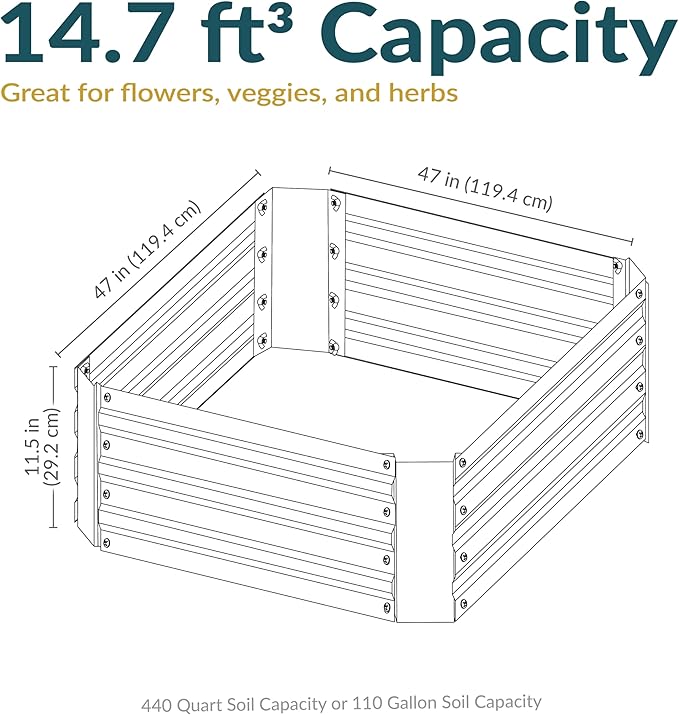 - GROW BEAUTIFUL PLANTS AND FLOWERS: This galvanized steel raised garden bed measures 47" W x 47" D x 11.5" H and weighs 12.8 lbs. It has a soil capacity of 110 gal (14.7 cu ft).