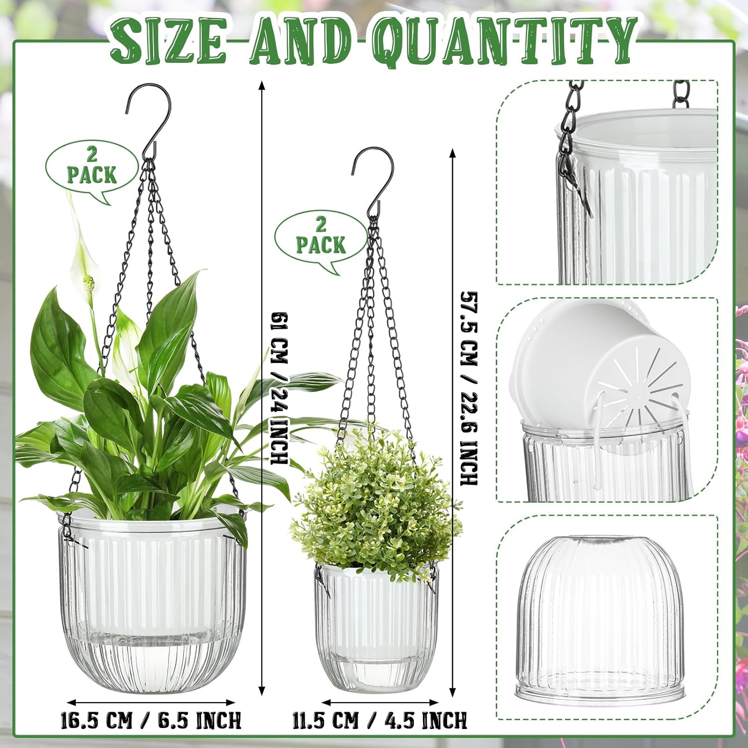 - Transparent Design for Water Level Visibility: the thoughtful transparent design is not just for aesthetics, but it allows you to check the water level in the hanging self watering hanging planters easily; This feature provides a convenient way of reminding you to add water in time and aids in maintaining plant health