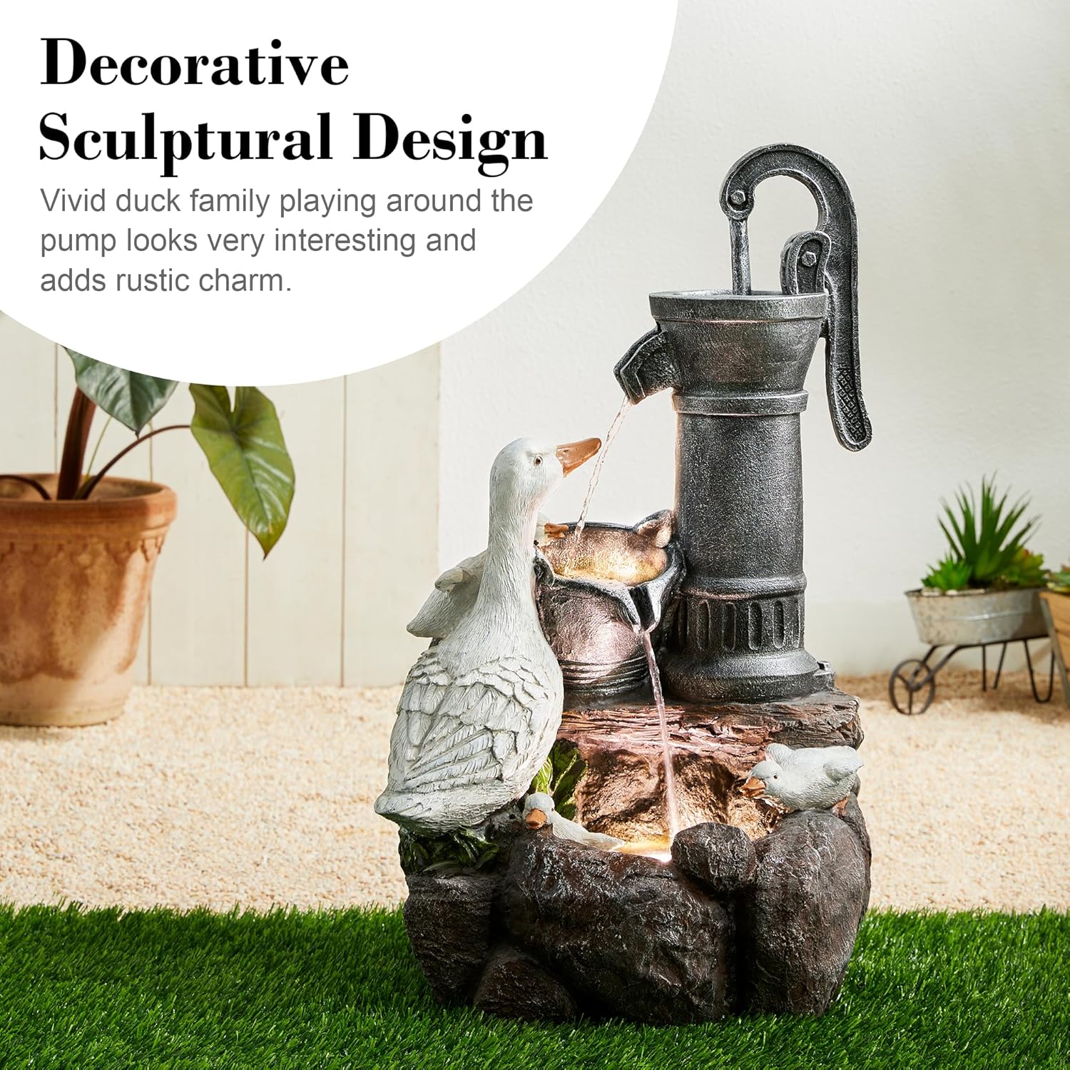Glitzhome 24" Farmhouse Duck Outdoor Fountain with LED & Pump – 2-Tier Cascading Water Fountain for Outside Garden Decor - Rustic Waterfall for Backyard, Garden, or Patio Decor