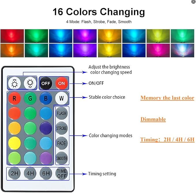 - [Timing Auto on/off and Memory Function] This led spotlight will auto turn on/off if you set a timing, it can set a 2 / 4 / 6 H lighting and have a timing off button, easy to use. This small spotlight will remember and show the last color setting when power on, do not need to reset it in every using, which is convenient in daily using.