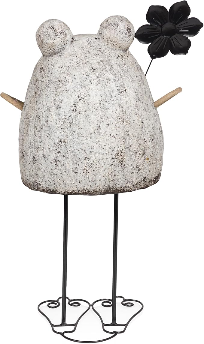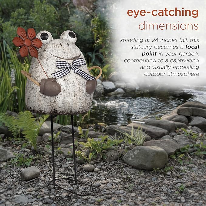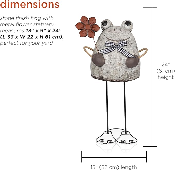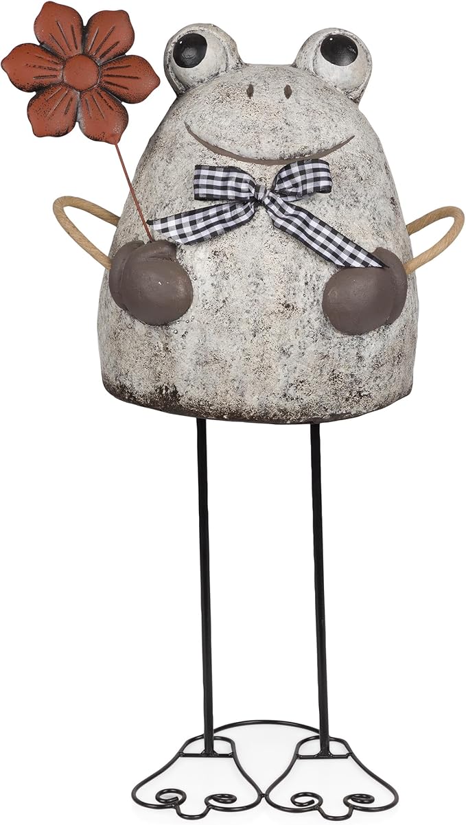 - TERRACOTTA AND METAL FROG HOLDNG FLOWER GARDEN STATUE: Adds a playful and inviting ambiance to any indoor or outdoor setting such as gardens, entryways, patios, backyards, pathways, decks, and more