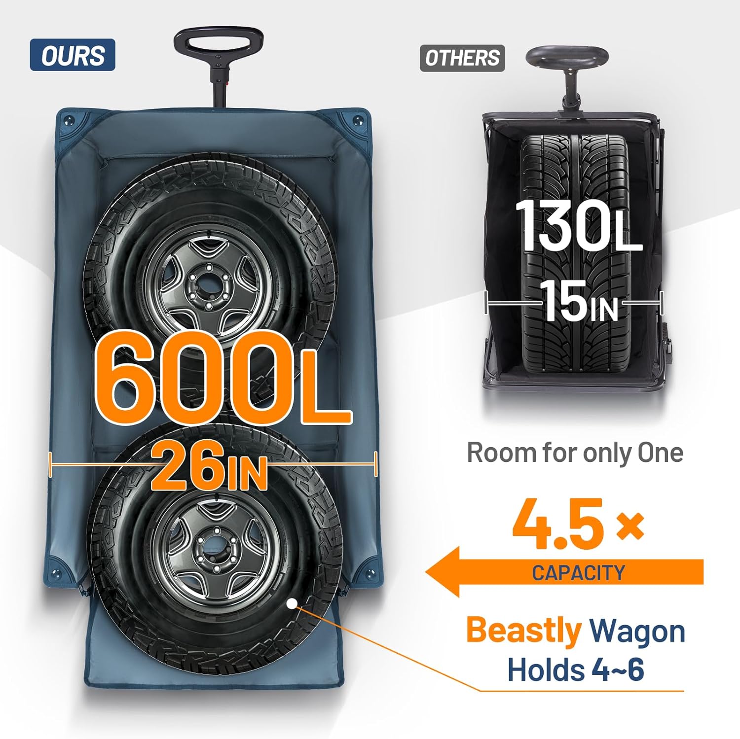 - WIDER & LARGER CAPACITY: Our widened collapsible folding wagon measures 41.5 "L x 26 "W x 14 "H, providing more storage space than the regular wagon. Maximum storage capacity is 600L/11 cu.ft, 350% more than other products. The cart can hold up to 400 lbs. and comes with side pockets and mesh cup holders to hold all your outdoor gear at once. The included cargo net holds even more items for increased efficiency.